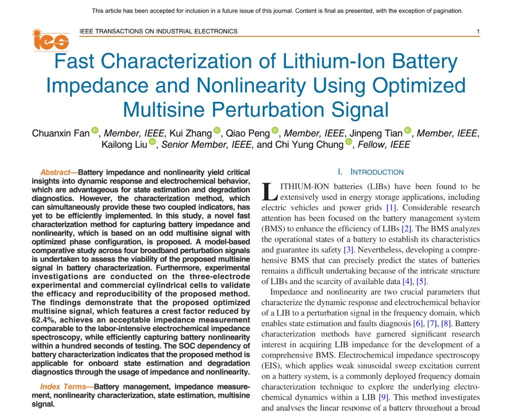 近日,我校米兰体育VIP推单范传鑫博士以第一作者身份、米兰app官方版下载安装手机版苹果为第一署名单位,与香港理工大学张奎博士、英国贝尔法特女王大学彭琦奥博士、香港理工大学田金鹏教授、山东大学刘凯龙教授、香港理工大学钟志勇教授深度合作,在国际权威期刊《IEEE Transactions on Industrial Electronics》上发表了学术论文:“Fast characterization of lithium-ion battery impedance and nonlinearity using optimized multisine perturbation signal”。该期刊是中科院工程技术一区TOP期刊,涉及领域包括自动化与控制系统、工程:电子与电气、仪器仪表等,影响因子7.5。