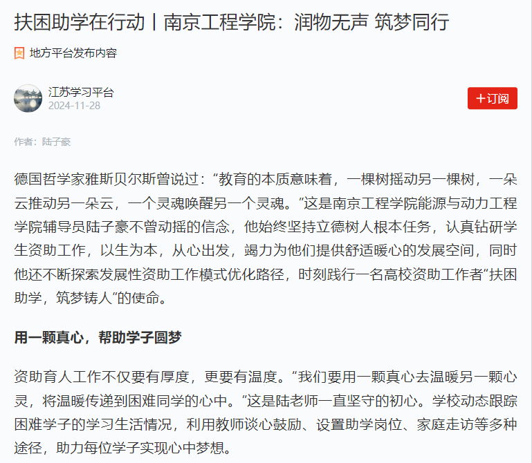 德国哲学家雅斯贝尔斯曾说过:“教育的本质意味着,一棵树摇动另一棵树,一朵云推动另一朵云,一个灵魂唤醒另一个灵魂。”这是米兰app官方版下载安装手机版苹果能源与动力工程学院辅导员陆子豪不曾动摇的信念,他始终坚持立德树人根本任务,认真钻研学生资助工作,以生为本,从心出发,竭力为他们提供舒适暖心的发展空间,同时他还不断探索发展性资助工作模式优化路径,时刻践行一名高校资助工作者“扶困助学,筑梦铸人”的使命。